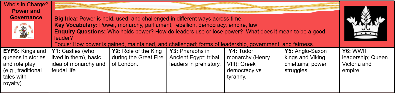 In history, our “golden threads” are the big ideas that run through all year groups, linking topics together and giving children a sense of continuity in their learning. They help pupils make connections across time and place - for example, by revisiting themes like power, identity, migration, innovation and daily life in different historical contexts.